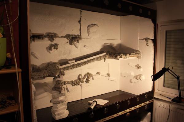 Alle Teile der Wände sind aus Styropor in unterschiedlichen Dicken grob ausgeschnitten. Jede Lage ist mittels Silikon verklebt und anschließend durch kleine Rundhölzer verstärkt worden. Die eigentliche Arbeit liegt aber in der detaillierten Modellierung der Schichten. Mit Hilfe von Messern, Lötlampen und Heißluftfön sind die Schichten gut zu bearbeiten. Bei dem schmelzen von Styropor entstehen GIFTIGE GASE, hier muss unbedingt für eine ausreichende Lüftung gesorgt werden. Zusätzlich ermöglicht Bauschaum eine Felsartige Struktur zu erstellen. Bei dem Umfang PU-Schaum unbedingt die Anleitung beachten, dieser ich hochgradig gesundheitsschädlich im nicht ausgehärteten Zustand!